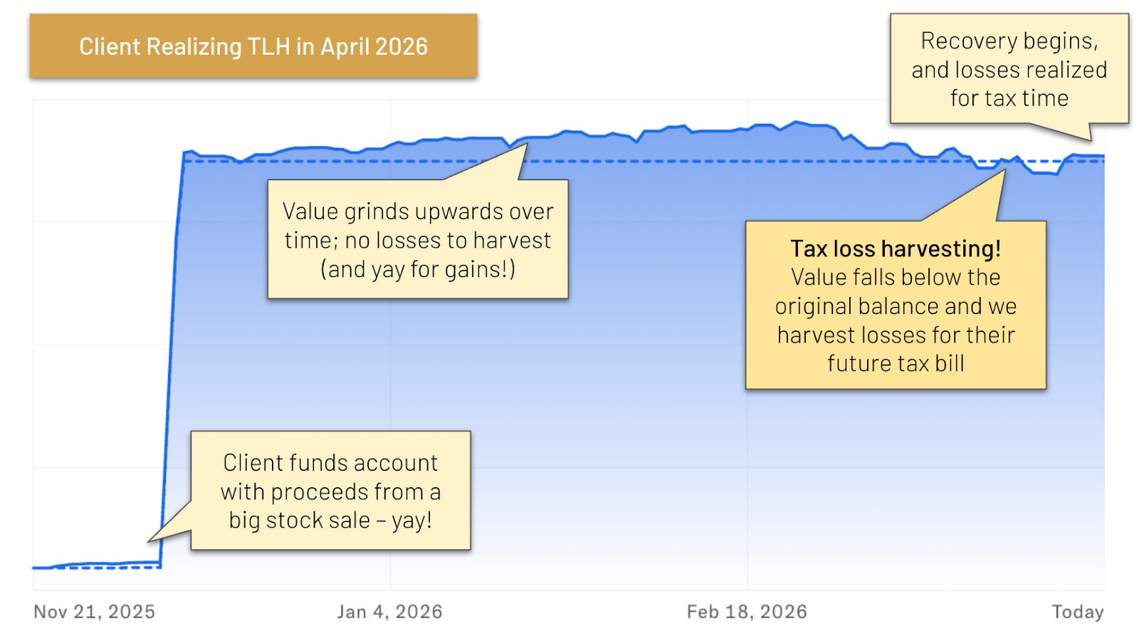On March 20, 2026, the S&P 500 was down 9% from highs just a few weeks earlier. Some of our clients were getting tax loss harvesting opportunities left and right – and others, not.