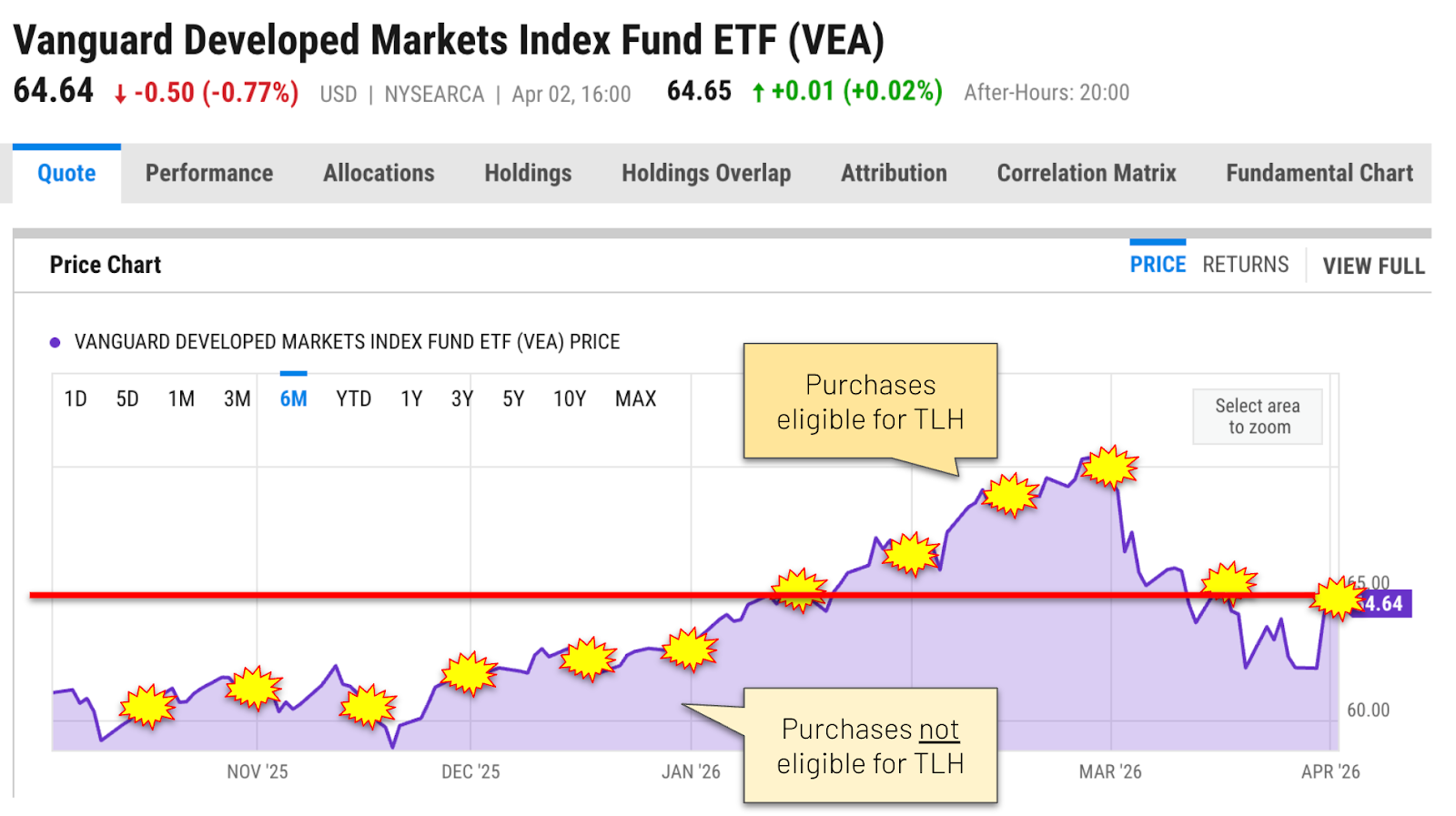 Consider the below example of someone who is dollar-cost averaging every two weeks into VEA, an ETF for international developed markets equities. Because their purchases (little yellow explosions, you’re welcome) are spread out over multiple dates at multiple prices, some will be in gain and others will be in loss, potentially creating more opportunities for tax loss harvesting.