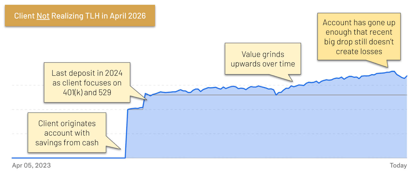 That’s not every account’s story. Here’s an example of a client’s taxable account in which there have been no recent TLH opportunities. The account was last funded in 2024 – this client is a fantastic saver, just focused on other accounts! – and it’s appreciated enough that even recent drops still leave them with plenty of gains on paper. So, no TLH opportunity… but also, no tears! Yay for this client’s account going up. It would be a bummer if they’d been invested for two years and in a net loss.