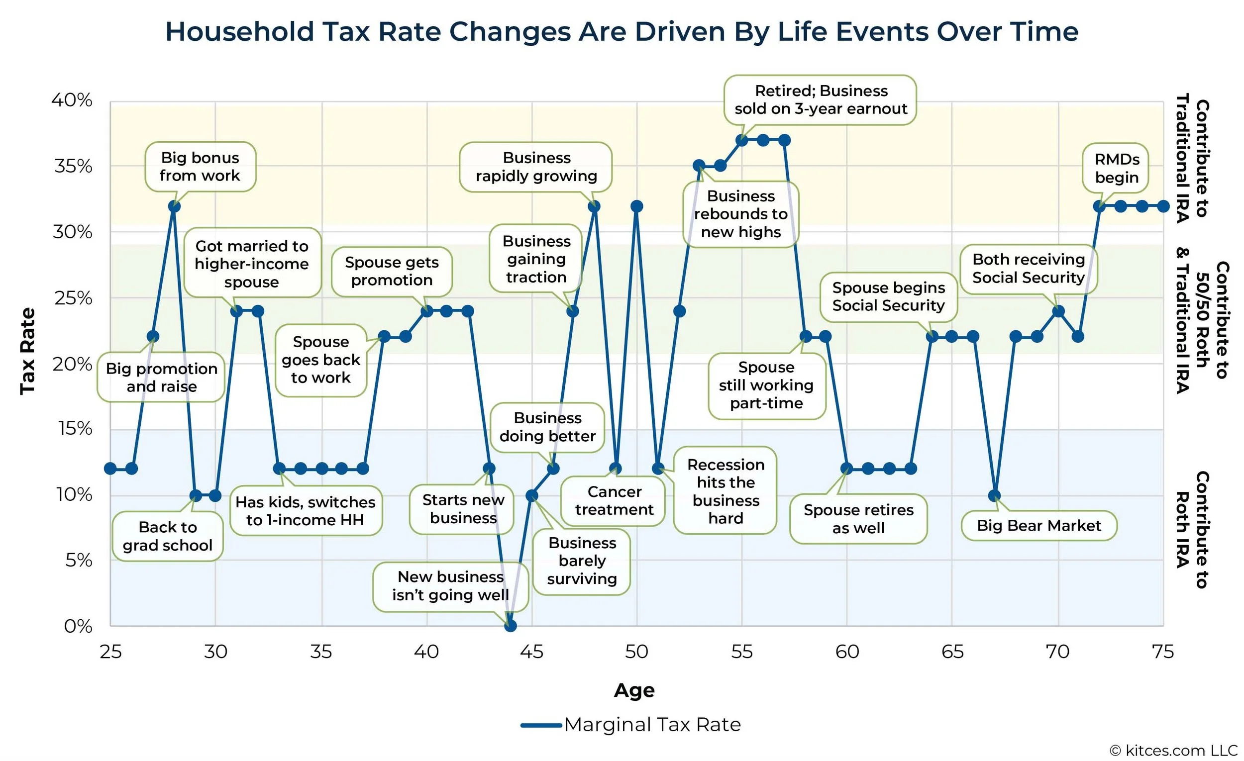 Kitces.com. “Household Tax Rate Changes Are Driven by Life Events Over Time.” 25 Aug. 2021. From Limits Of Tax Diversification And The Tax Alpha Of Roth Optimization.